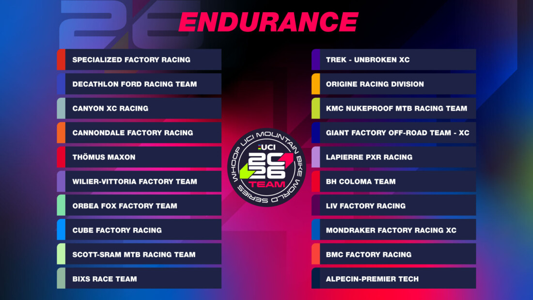 Die 20 Teams, die das Endurance-Starterfeld der WHOOP UCI Mountain Bike World Series bilden, wurden bestätigt. Damit sind einige der größten Namen des Sports bei allen neun Rennen des UCI Cross-country Olympic (XCO) und Cross-country Short Track (XCC) World Cup Kalenders 2026 garantiert am Start. Fahrer wie Christopher Blevins (Specialized Factory Racing), Victor Koretzky (Specialized Factory Racing), Alan Hatherly (Giant Factory Off-Road Team – XC), Evie Richards (Trek – Unbroken XC), Alessandra Keller (Thömus Maxon), Jenny Rissveds (Canyon XC Racing), Mathieu van der Poel (Alpecin-Premier Tech) und Puck Pieterse (Alpecin-Premier Tech) haben alle einen sicheren Startplatz.
